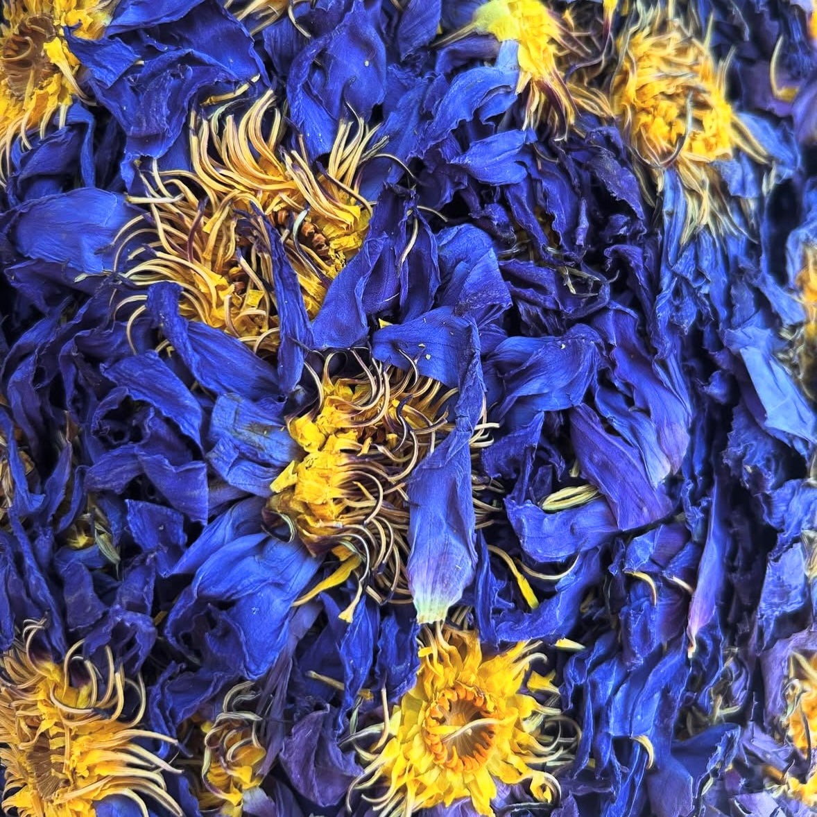 Our organic Deep Purple Lotus has been harvested at the peak of maturity with deep blue to purple petals and beautiful yellow stamens